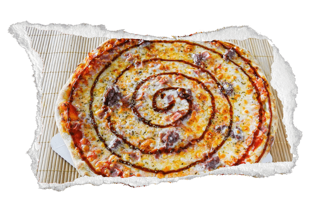 Tomate, mozzarella, pepperoni, bacón, aceite de guindilla y orégano