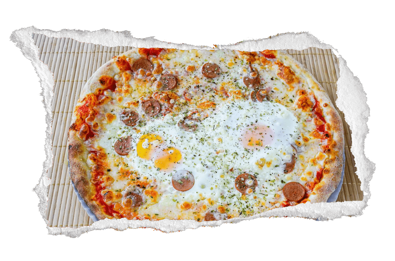 Tomate, mozzarella, huevo, salchicha y orégano